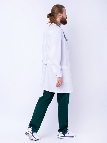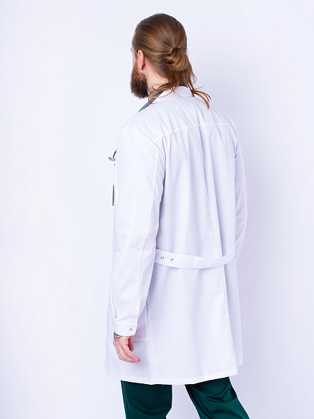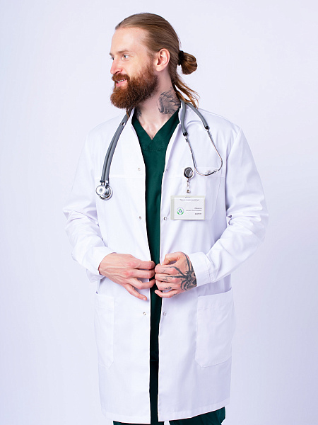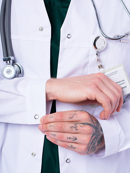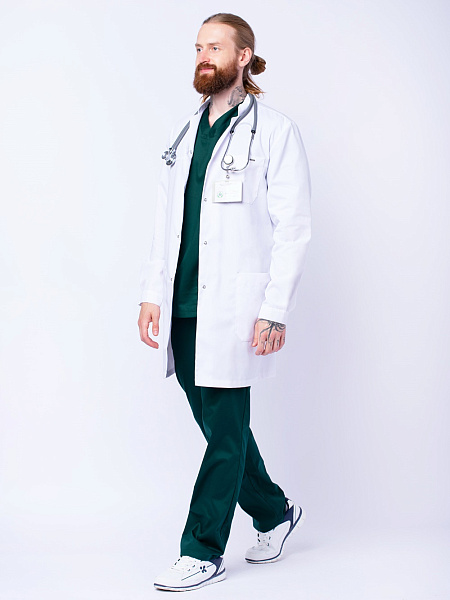 Мужская медицинская блуза «Немо» имеет прямой силуэт. Блуза с V-образным вырезом хирургического типа, со стрейч-эффектом. Удобный цельнокроеный короткий рукав. Имеются два боковых накладных кармана, в одном из них дополнительный небольшой карман, нагрудный карман с левой стороны с вшитой резинкой для ретрактора. Идеальная посадка по фигуре.