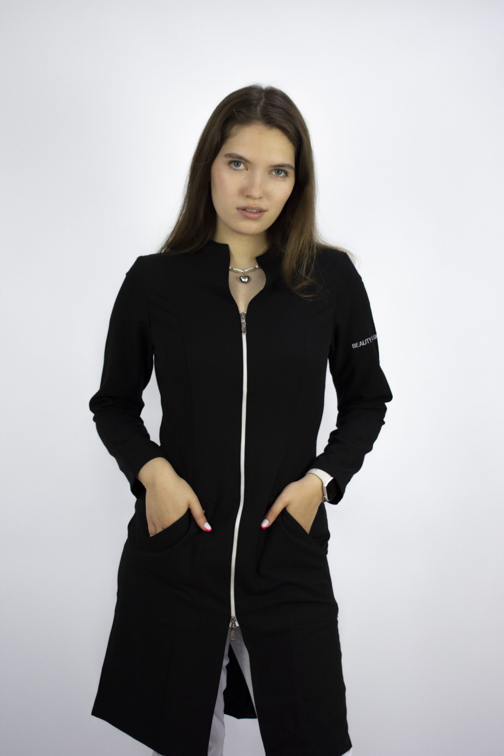 Рукав 7/8, контрастная застёжка на тракторной молнии, функциональные накладные карманы, вышивка белого цвета на левом рукаве Beauty&spa с профилем девушки делают халат не только удобным, но и стильным. Стрейч-эффект обеспечивает прилегающий силуэт. Подходит для сотрудниц бьюти-индустрии. Модель идет размер в размер. Выбирайте на размер больше, если предпочитаете более свободное облегание. Длина халата ниже середины бедра.