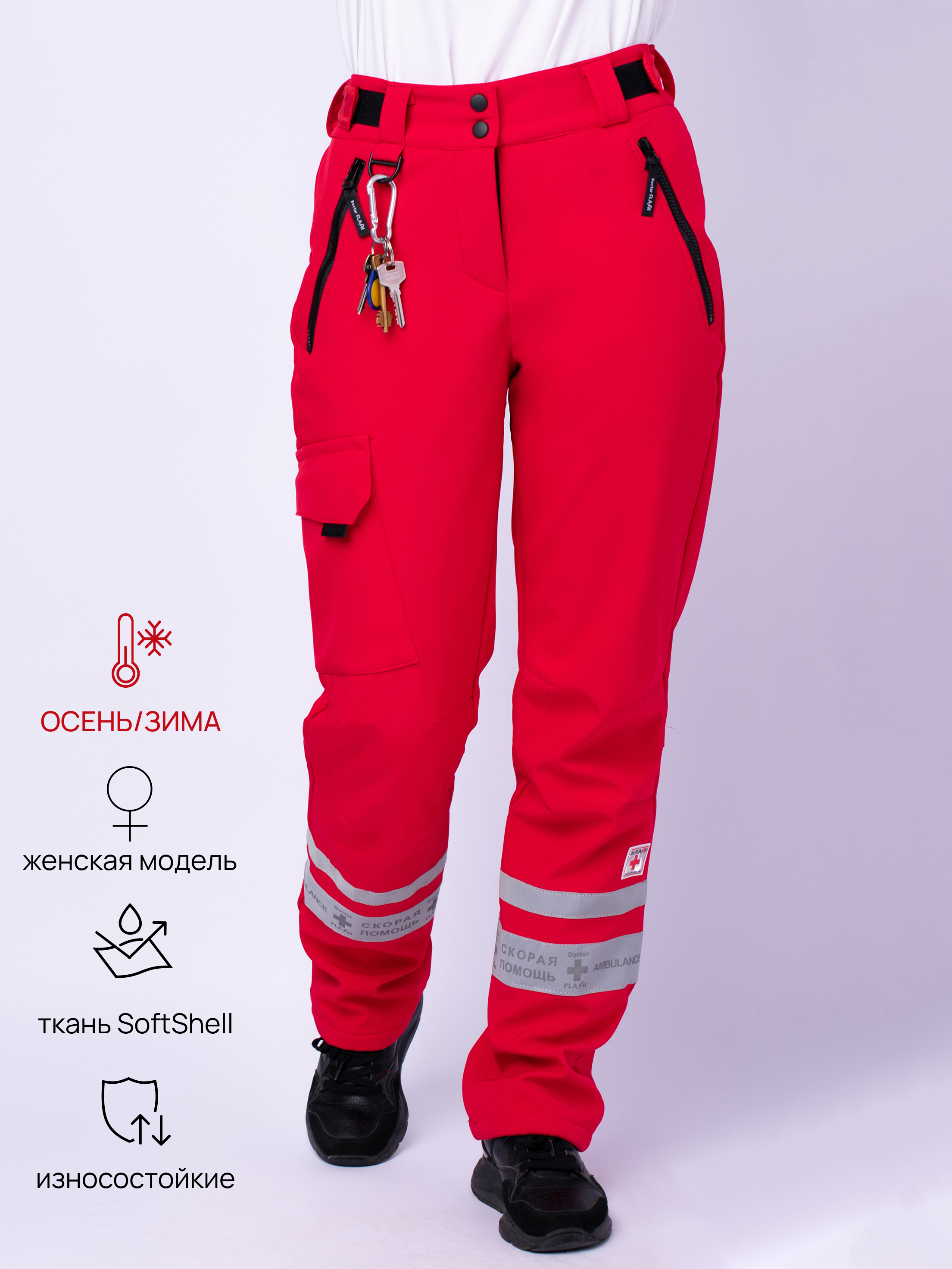 Утеплённые женские брюки «Хелпер» для скорой помощи созданы для тех, кто проводит смены на улице, в машине и в движении. Высокотехнологичная трёхслойная ткань SoftShell сочетает в себе защиту от ветра и влаги, отличную износостойкость и комфорт: внешний слой отталкивает воду и грязь, средний «дышащий» слой помогает отводить лишнее тепло и влагу, а внутренний мягкий флис надёжно сохраняет тепло. Прямой крой не сковывает движений, удобная застёжка на молнию и две кнопки выдерживает частые наклоны и посадки, а регулируемый пояс позволяют подогнать посадку под индивидуальные параметры. Функциональные карманы и карабин продуманы для быстрого доступа к нужным мелочам. Ниже колена расположены два ряда светоотражающих лент шириной 25 и 50 мм, которые делают сотрудника заметным на дороге и во дворе в тёмное время суток. Женские брюки для скорой помощи «Хелпер» -это профессиональная тёплая спецодежда для медиков, водителей и сотрудников экстренных служб: тёплые, ветронепроницаемые, влагостойкие, удобные в уходе и идеально подходящие для длительных смен в городских условиях. Сделайте ваш рабочий день легче и ярче - доверьтесь качеству и современному дизайну от Doctor FLASH (Доктор ФЛЕШ)!