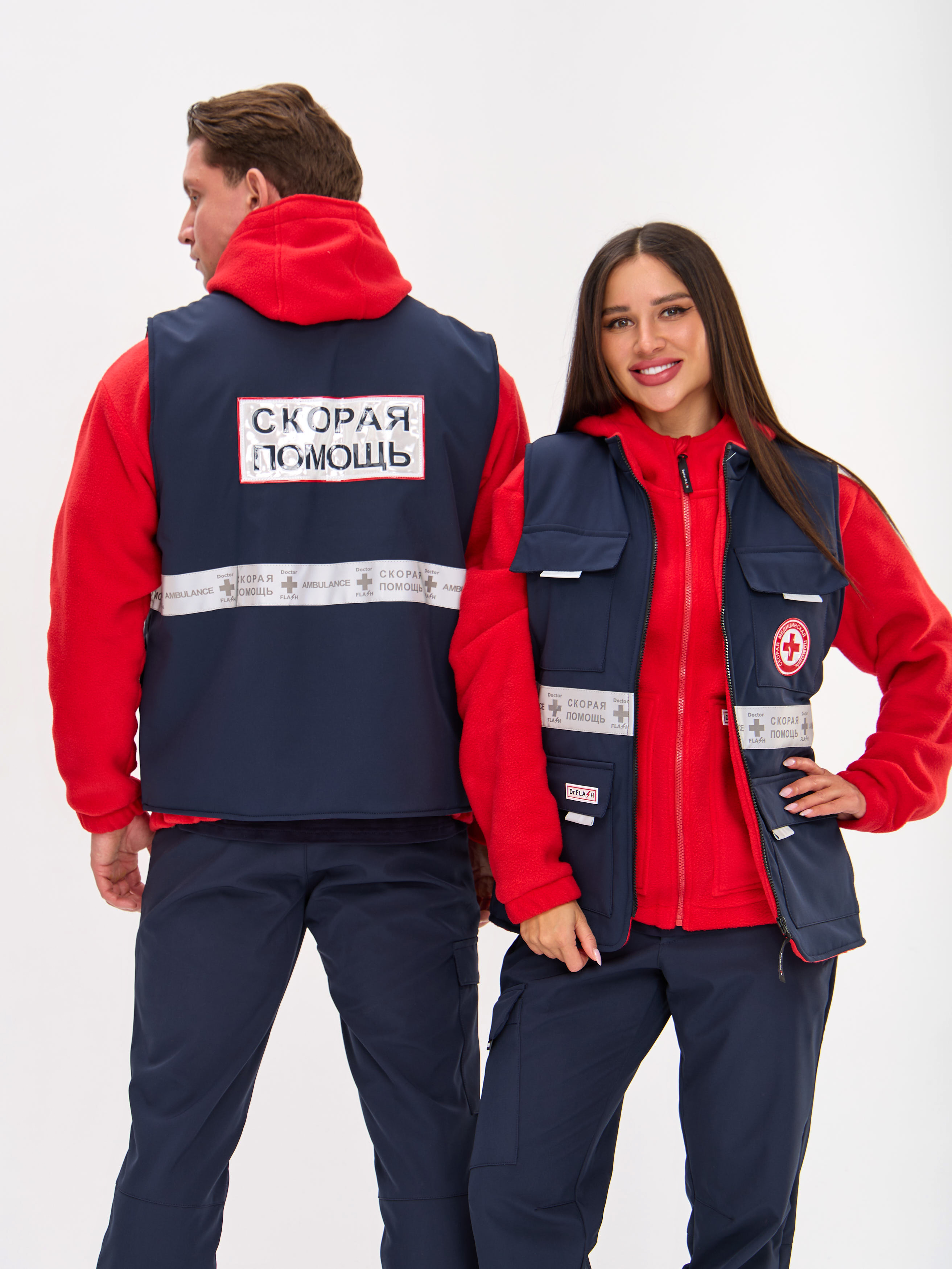 Утеплённый жилет унисекс для скорой помощи - тёплый и лёгкий верхний слой, который удобно надевать поверх худи или толстовки. Прямой силуэт и центральная застёжка молния обеспечивают комфортную посадку на мужчине и женщине, не стесняя движений во время приёмов, выездов и работы в автомобиле. Внешняя часть жилета выполнена из курточной ткани SoftShell. Трёхслойный «дышащий» материал защищает от ветра и влаги, хорошо держит форму и отличается высокой износостойкостью, а внутри - флисовый подклад, который быстро согревает и сохраняет тепло в течение всей смены. Жилет медицинский от Доктор Флеш продуман для работы бригад скорой помощи: на спинке крупный ПВХ шеврон «Скорая помощь», на груди круглый знак «Скорая медицинская помощь» - экипаж легко даже издалека. Для размещения всего необходимого предусмотрено 7 функциональных карманов: два объёмных накладных кармана на талии, два боковых кармана в шве, два нагрудных накладных кармана и один внутренний для документов или телефона; все накладные карманы оснащены светоотражающими элементами, повышающими вашу заметность в тёмное время суток и при освещении фарами. Дополнительно по жилету проходят светоотражающие полосы шириной 50 мм с коэффициентом световозвращения 500 кд/(лк·м²), что соответствует требованиям к сигнальной спецодежде. Такой жилет унисекс для скорой помощи становится незаменимой частью зимнего и демисезонного комплекта: он облегчает верхнюю одежду, добавляет тёплый слой, оставляя руки свободными, и подчёркивает профессиональный внешний вид всей бригады.